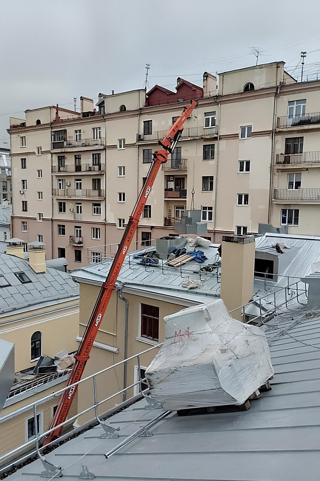 Типовой московский двор советской застройки — это не самая удобная площадка для работы подъемной спецтехники. Узкая арка на въезде, стихийная парковка местных жителей, сеть проводов и тетрис балконных козырьков по фасаду. В этих условиях нужно было поднять конструкции на крышу, не перекрывая небольшой двор полностью.